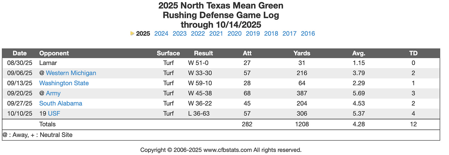 In 2025, NT is averaging 200 yards a game allowed thus far. Army, and USF went over three bills. The silver lining is that no team has broken 6-yards a carry.1 That’s an MGN number that usually is a sign that you are simply bad. You can get away with allowing 4-yards per run, maybe 5, but 6 indicates you are getting gashed. Again, this is a rough approximation.