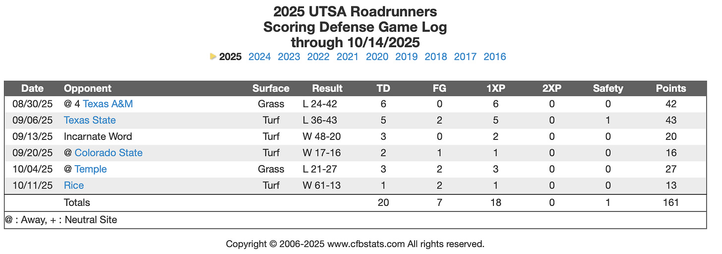 So expect more of the same from North Texas. I would put UTSA’s defense somewhere between South Alabama’s and USF’s in talent. Texas State runs a similar offense and they put up 43 vs the Runners. Colorado State is bad, Temple is improving and moved the ball well. Rice had a disaster happen to them — so it is tough to gauge. A&M simply out-talented these guys.