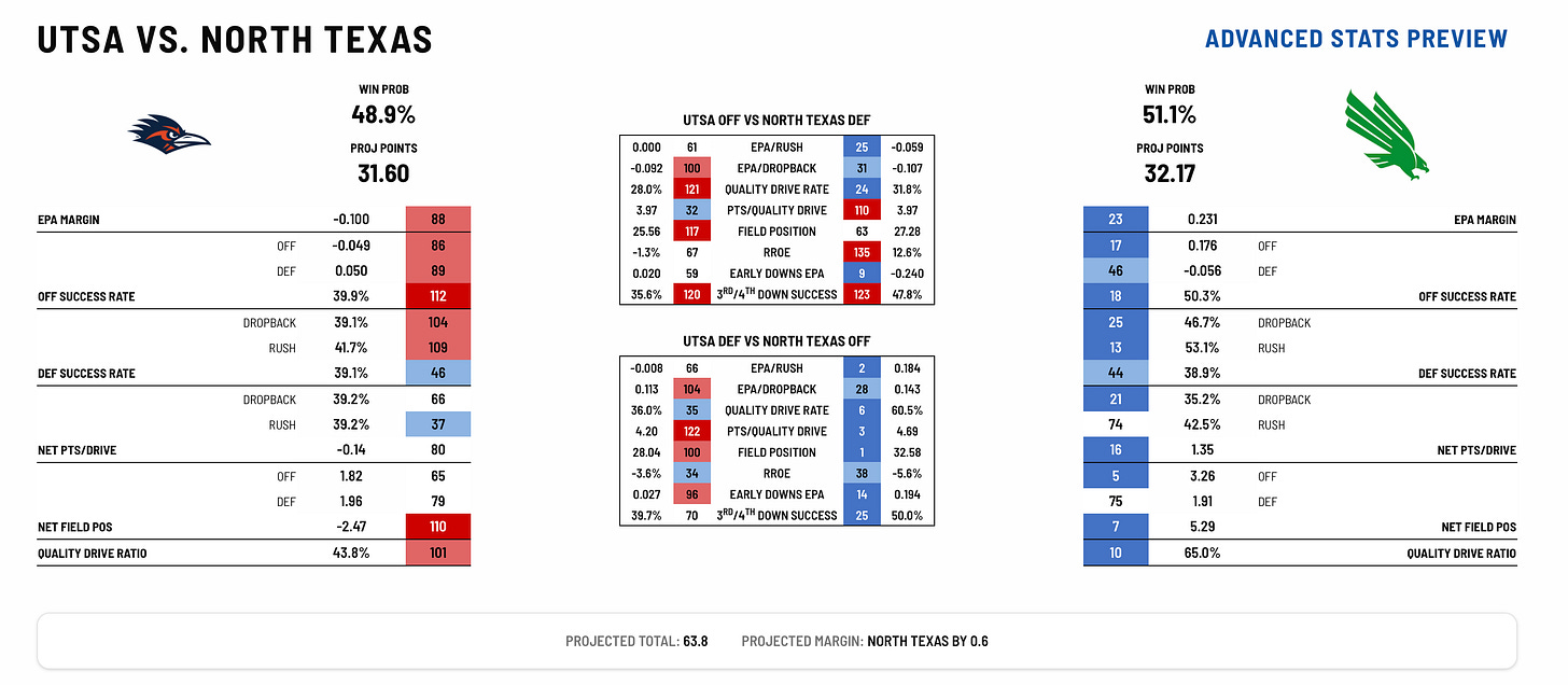In short, it looks like UTSA is dangerous when they are on and UNT is vulnerable when they are not on. Pretty typical stuff.