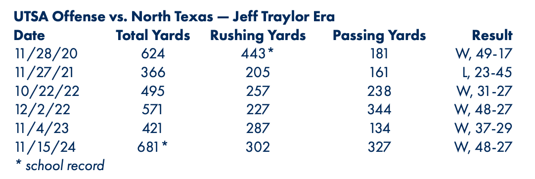 Jeff Traylor isn’t dumb. He maybe isn’t the best coach in the world, but he can recruit, and he knows how to win a little. In the last five years, he’s leaned on the run game against UNT and had tons of success. I don’t mean to hurt you, but here are the numbers: