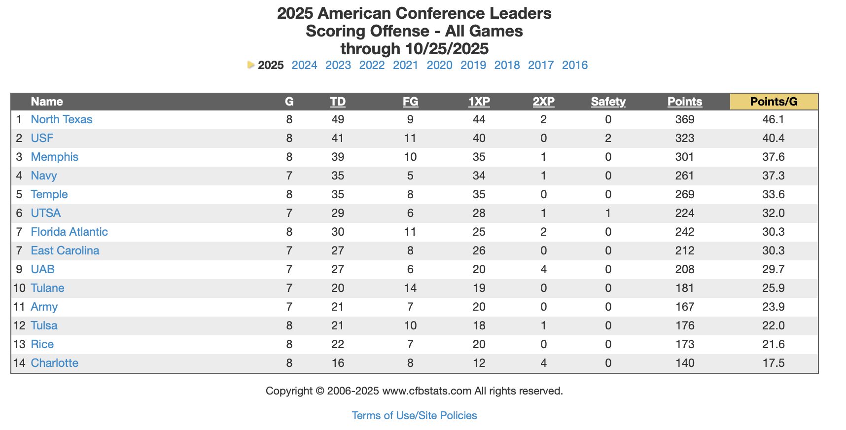 I am not saying Navy isn’t a solid team, but just that they have not been tested by anyone really good. North Texas has also been in some tight games against competition that’s not super great (Army, WMU) on the road. So it goes. 1