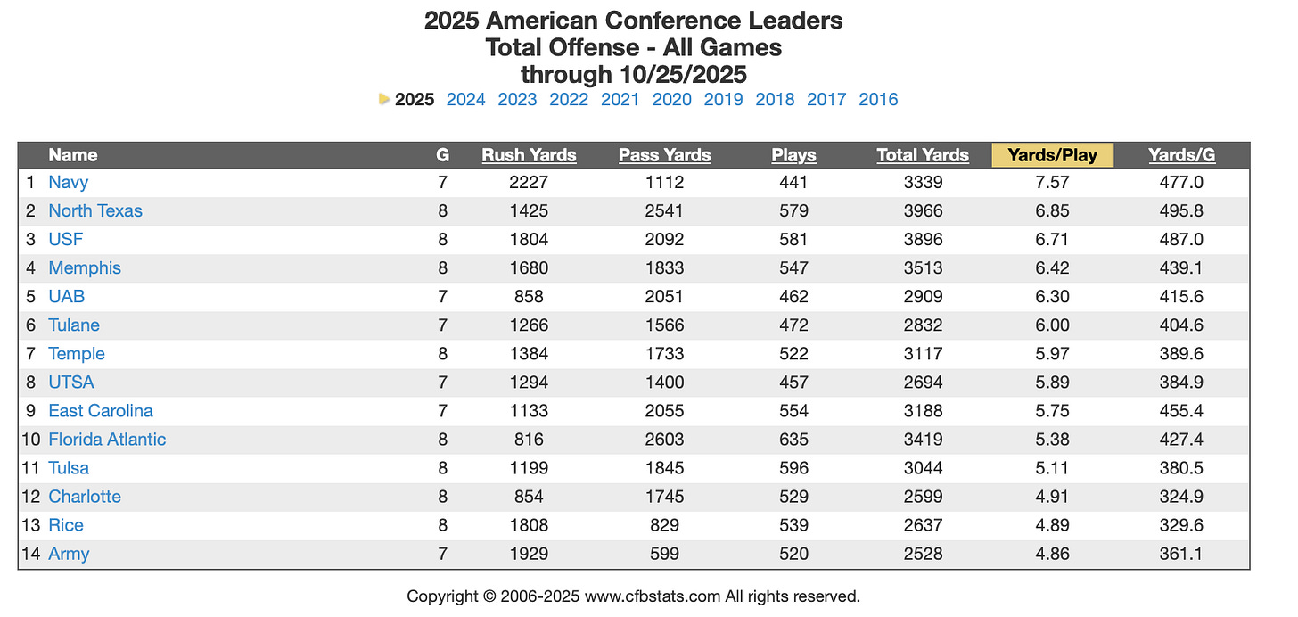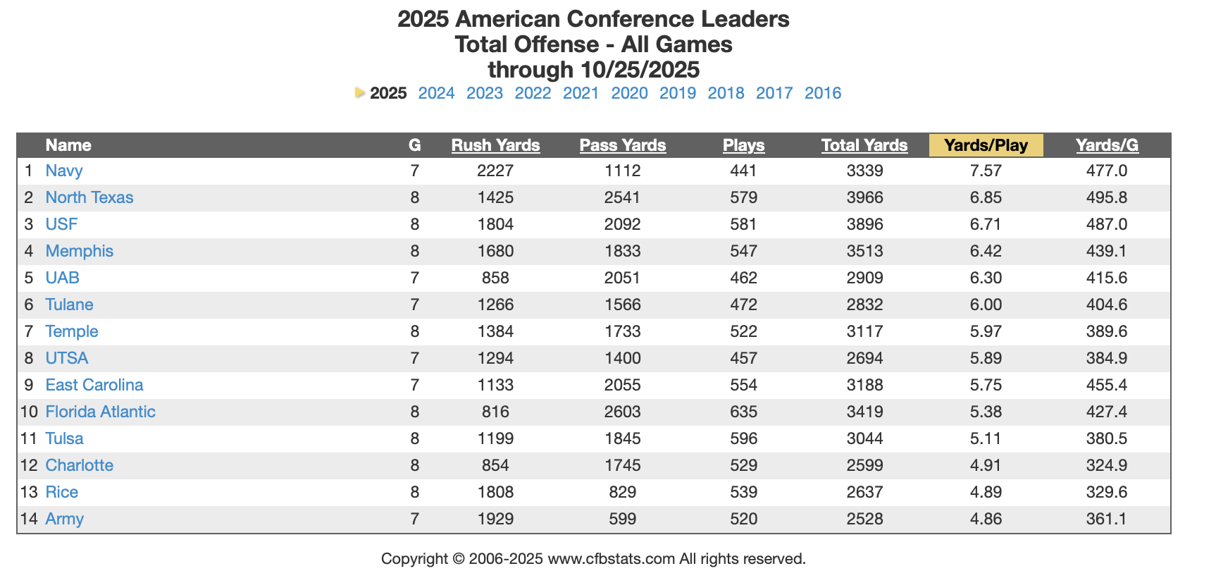 Navy (11th at 7.8) is hanging around the bottom of the league in yards/attempt per pass with the likes of UTSA (12th 7.9), Charlotte (13th 8.7) and UAB (14th 9.9). North Texas is throwing for 8.6 yards per attempt, for context.5