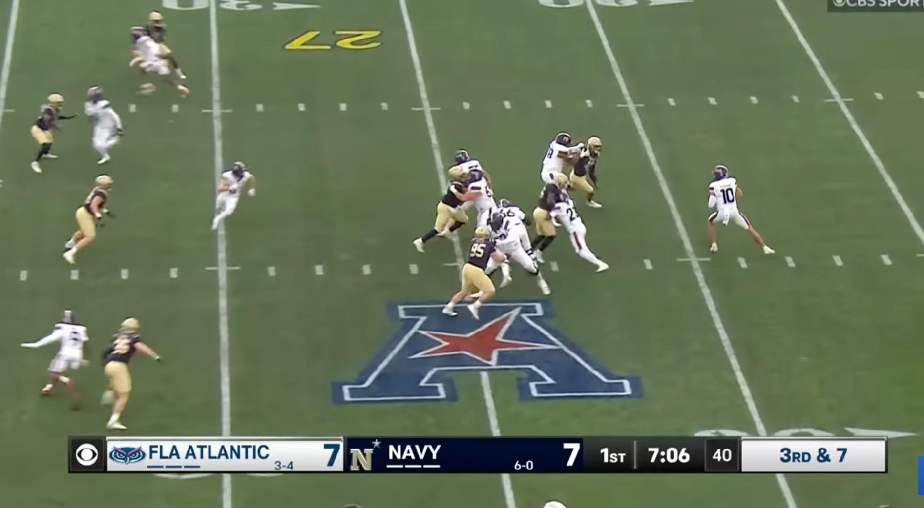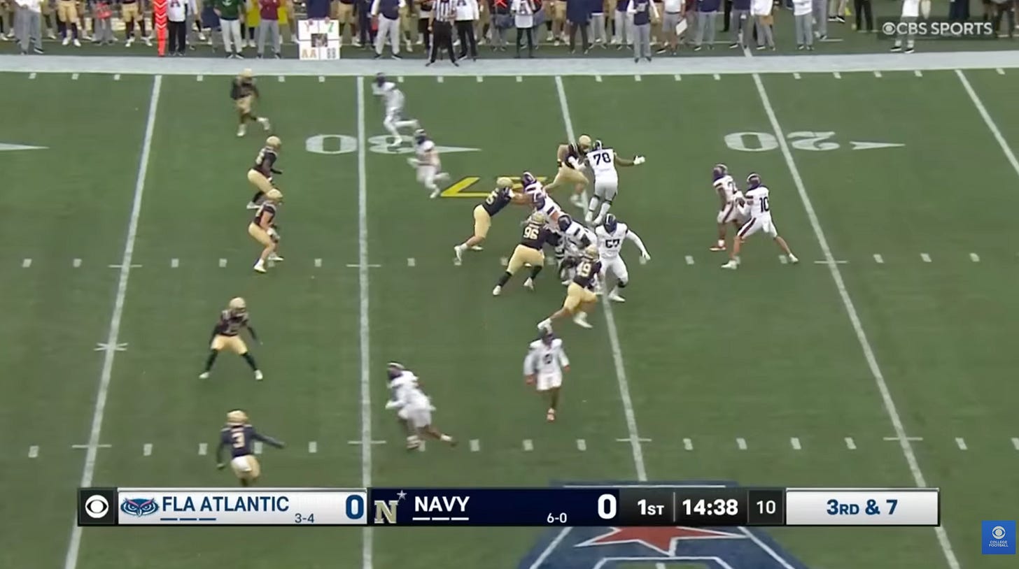 Navy didn’t always bring pressure, on the first 3rd-and-medium they sat back in a five-under look. FAU converted. The Owls were able to move the ball well including with the old Air Raid staple 92 Post. 4