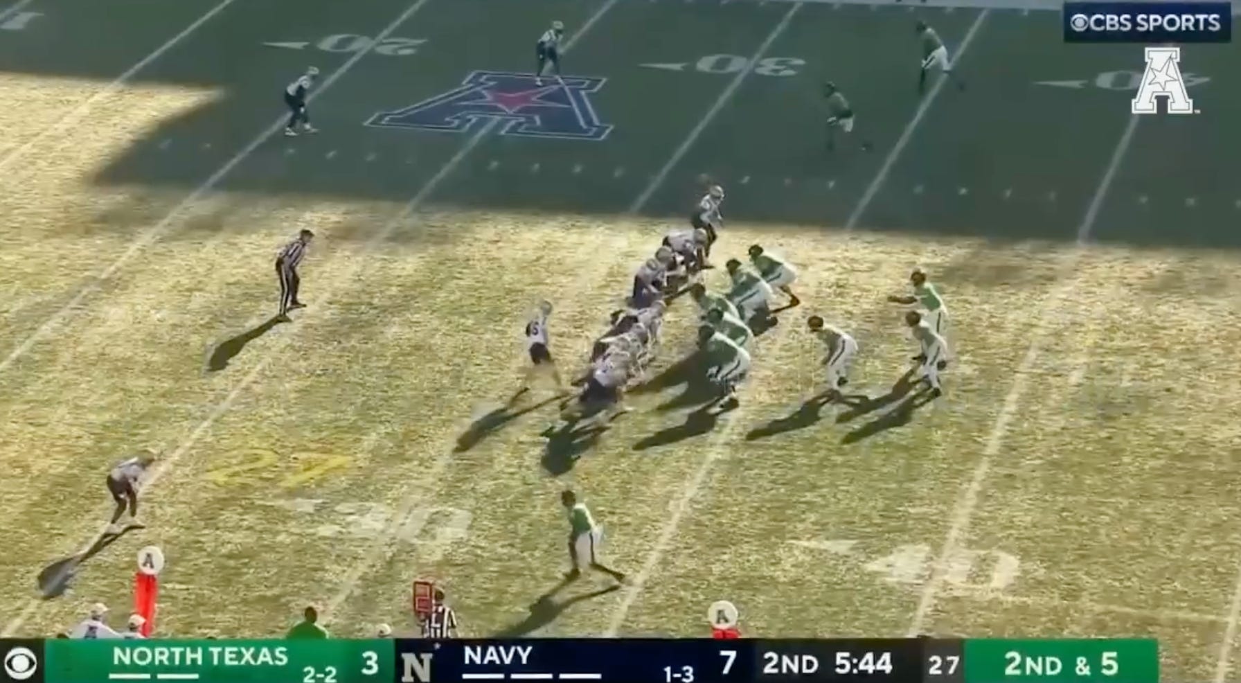 In a nutshell, North Texas is an Air Raid team against a hybrid 4-2-5/3-4 team.2 Navy likes to use a linebacker type as the typical pass rushing end in a 4-down system. So they have 90 Moutome as a DE (263/6-3), 96 Landon-Robinson as their nose (287/6-0), and 95 Griffen Willis (273/6-1) as their other DT. Then they’ll use safety/linebacker bodies as the other rush end. They do this by design, as they are undersized already. Might as well put guys that can play football and do multiple things out there and give yourself a chance. They make up for lack of size with aggression.