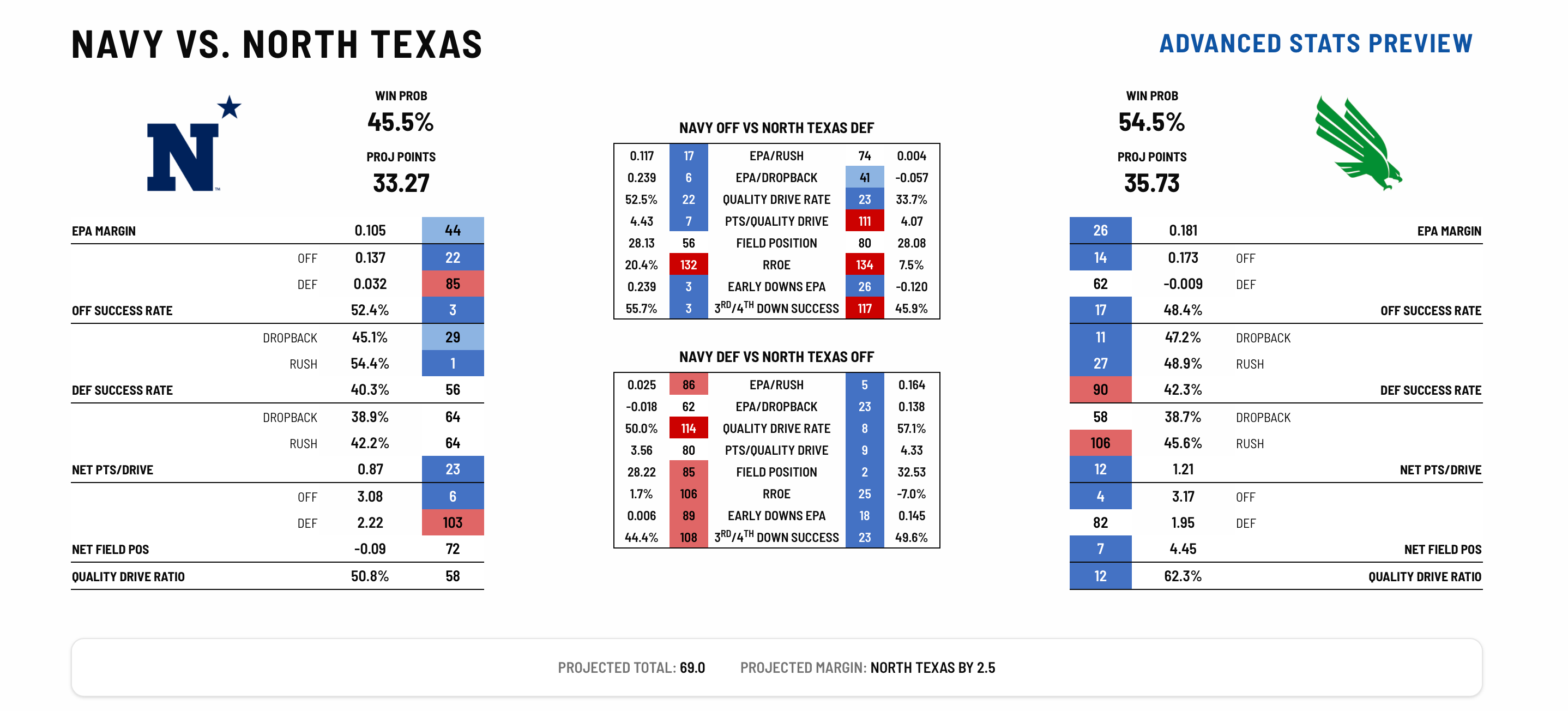 You might remember that North Texas played Navy two seasons ago in Maryland, and exploded for some big plays but were undone by sacks and turnovers. Chandler Rogers was famously (in our circles) sacked in a big moment and had a big rush in his face for another. He fumbled twice. He also scooted for a long run. That is pretty much what Navy is going for — they think they can win a game with their offense scoring in bunches, and their defense getting enough high-variance turnovers to win the game. This season, it has worked.