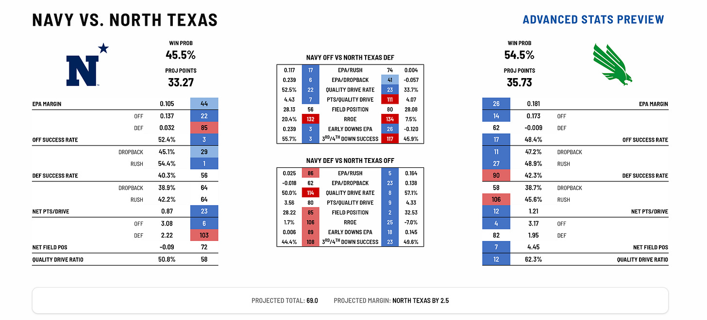 For what it is worth, North Texas very awful at defending designed QB runs. WMU, Army, USF, and South Alabama all had success. Navy has the best all-around QB in the league with respect to Byrum Brown — thanks to the sheer volume of attempts he has. Horvath is the danger.6