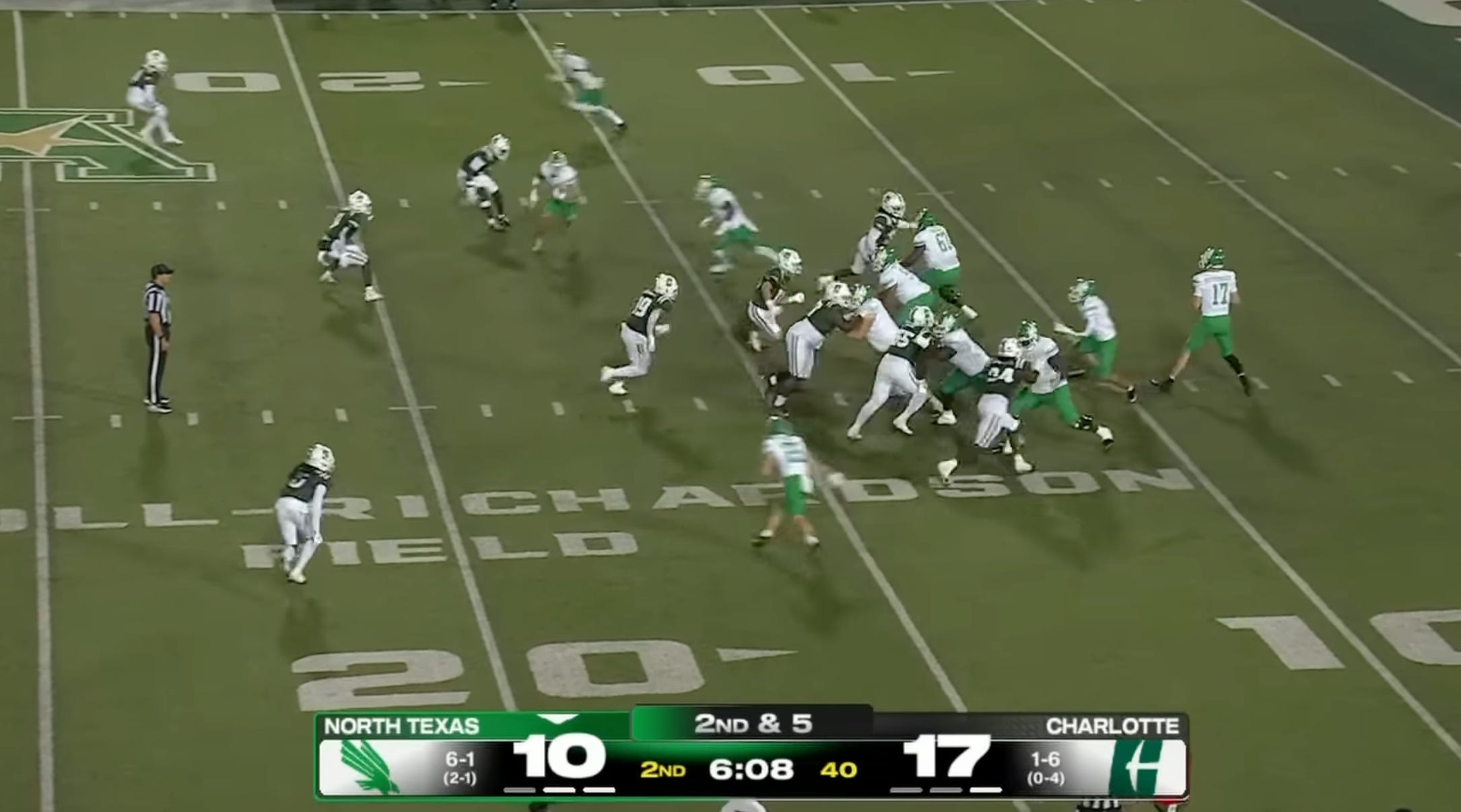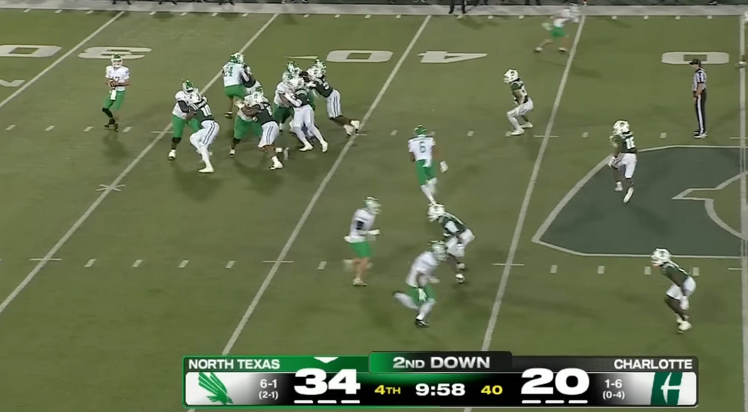 Against, FU they got pressure, and hit Veltcamp with just four. North Texas’ pass protection has not been amazing protecting Mestemaker. Charlotte was able to hit the QB and targeted freshman Caleb Hawkins. We noted that in the quick reaction. Here’s a screen grab from the 2nd half where Mestemaker was sacked after 24 got bull-rushed.