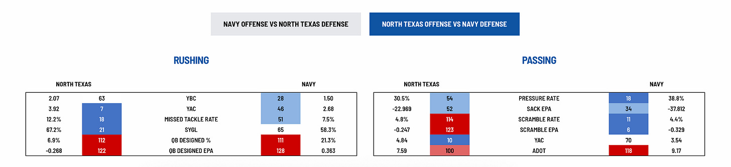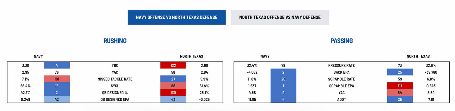We saw NT’s secondary get ripped up by some power formations and one, and two-man option routes by Charlotte early in the game on Friday. I fully expect Navy to take a few of those lessons for this one. A sneaky running theme is that teams that try to throw deep on North Texas have had success. Even Army hit a long one over the top. Expect the Naval Academy to test the air defense.
