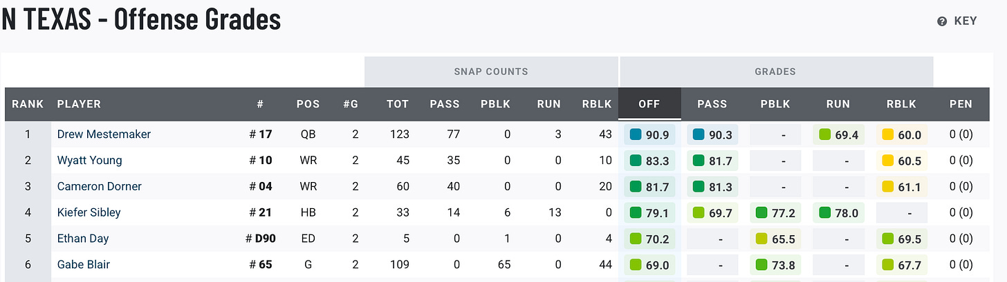 In this offense, a ‘25 variation of the Air Raid, a quarterback is crucial. Drew Mestemaker has been incredible. He fired off some NFL-level throws in Kalamazoo, and is not back in the friendly confines of Texas, where he has never thrown for less than 300 yards. WMU did their best to keep the ball away from him, but he led the Mean Green down the field for the necessary points to tie, and then win the game.