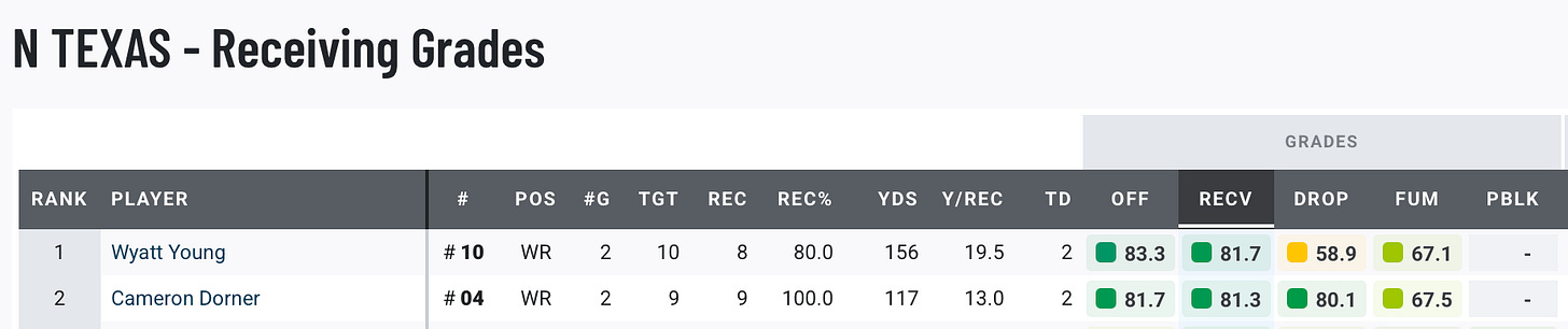 NT has been good (better than last year) but the pass rush game can improve. Lamar and WMU weren’t really very great at throwing the ball and WSU should be an improvement in raw talent, but a young QB will make mistakes and we can look for North Texas to try to make him process things under duress. I expect, depending on what the run game for WSU does, that the game plan will be largely vanilla for Jaxon Potter. One, or two read throws and lots of simple stuff to execute. North Texas has been solid (average!) tackling and that can be enough. Why? Well the offense for NT is still very explosive.