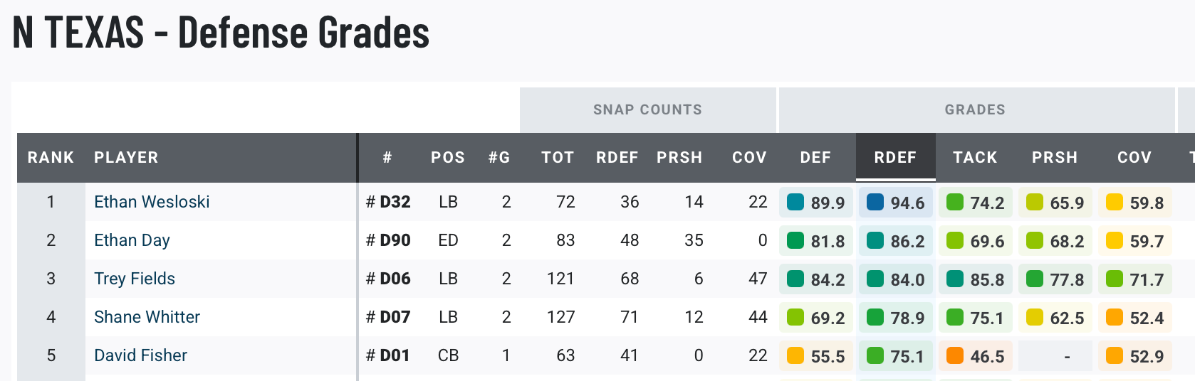 Does that track? Ethan Wesloski our top guy (also has 4 TFLs on the year, leading the squad), followed by Ethan Day and Trey Fields. Then Shane Whitter, and CB David Fisher. For me, it does. Wesloski has been our strong side linebacker making plays at the line and doing great. Ethan Day has blown up a lot, and caused a ruckus.