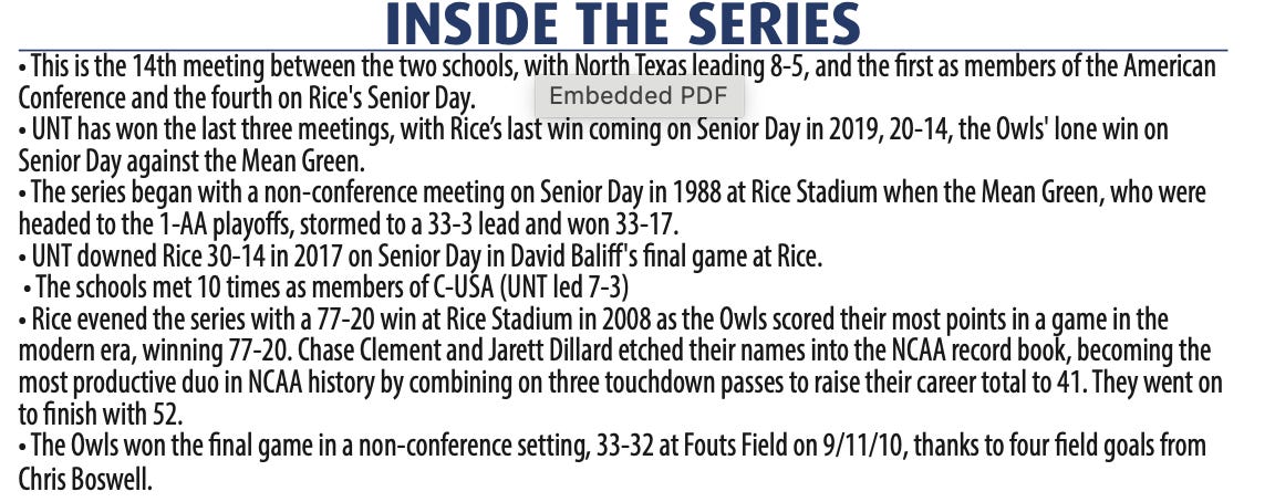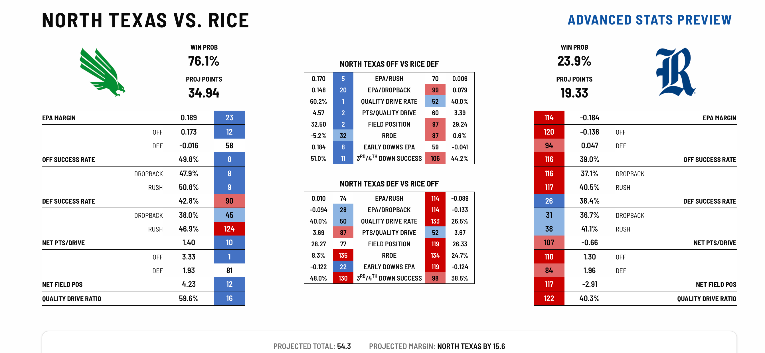 North Texas is brutally efficient at moving the ball and scoring. They have also shown they can control the clock — game plan vs Army was to take the TOP for a bit — and we are likely to see NT push the pace, get up early and force Rice to be uncomfortable.