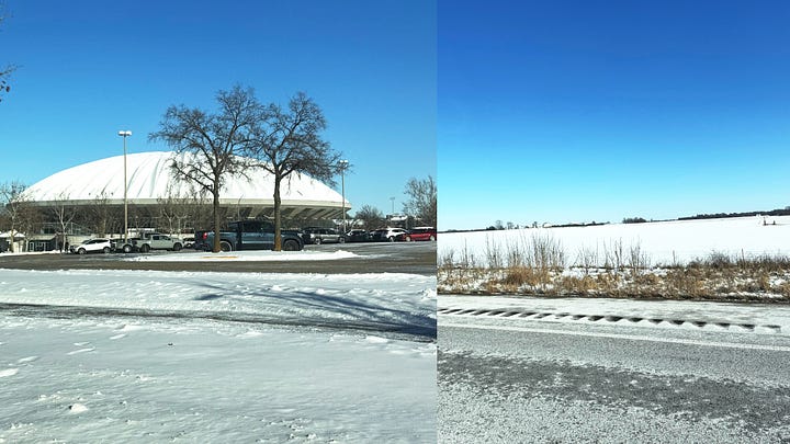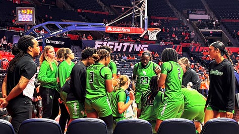 We drove through snow, and -1º weather to get to the town — about 2.5 hours away. My guesstimate was that we’d be six of about ten total Mean Green fans. I think I undersold it. I saw one parent, and two other green-clad people. So that’s about eight total Mean Greeners in town. After the game, Illini head coach Shauna Green said there were about 4,000 in attendance (generous) which was good given the conditions. It is the midwest, so folks were much more ready to navigate the snow and cold than your average North Texan.
