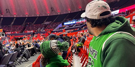 We practiced good cheering etiquette — for example saying “Go Mean Green” when they were shooting a free throw. Again my eldest also enjoyed their chicken nuggets promotion being thwarted. “I’m glad we ruined their nuggets thing.”