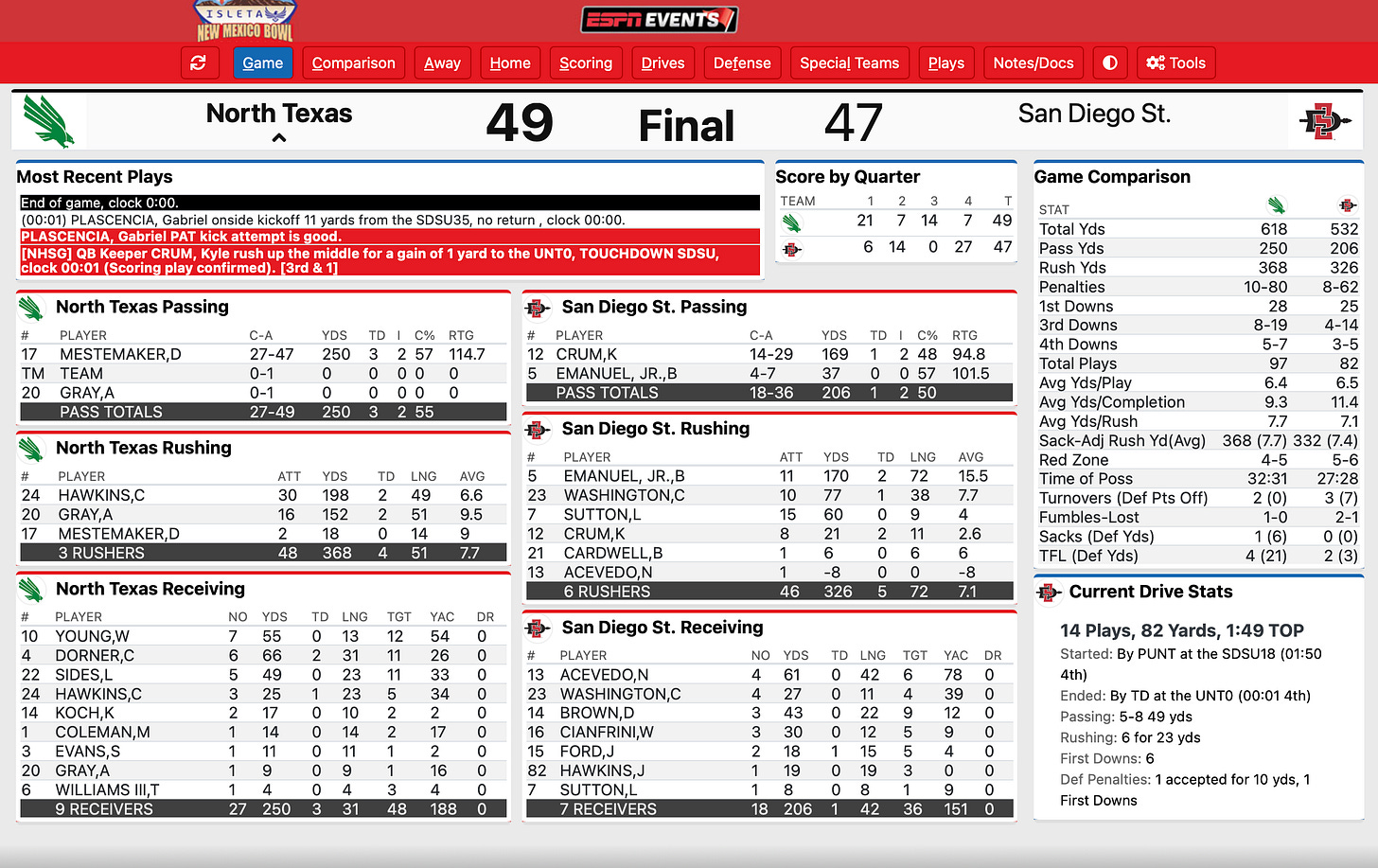 New Mexico Bowl Champs! Quick Reaction New Mexico Bowl: North Texas 49 San Diego State 47