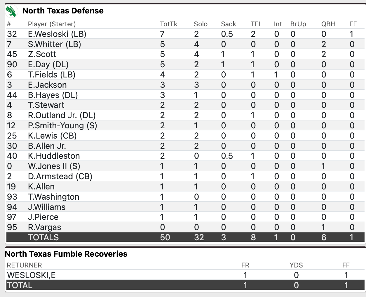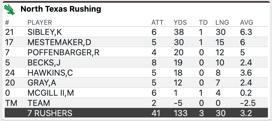 NT treated this game as something of an audition for the five backs they have to establish themselves. Starter McGill looked poor, and only managed a yard on six totes. Sibley had the best per-carry average, and Becks got the most carries. For me, I enjoyed watching Hawkins the most, but he looked like he tried to bounce the ball out too quickly.