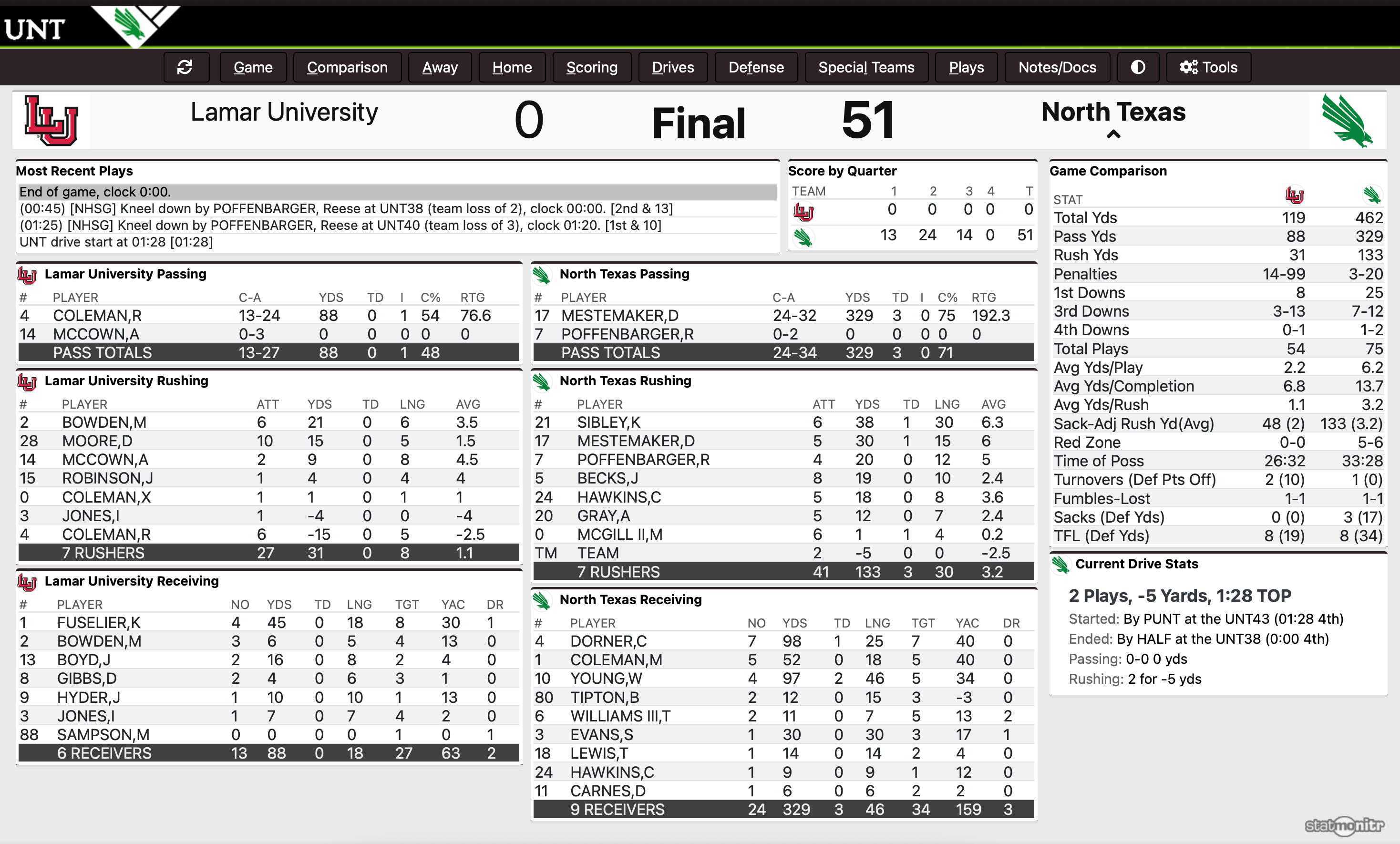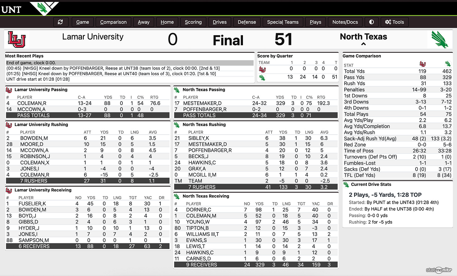 The defense forced 4-straight punts by the middle of the second quarter — and no drive was longer than 6-plays. Lamar was in a 0-27 hole when Trey Fields grabbed an interception. NT got a field goal, just enough kill the game. Lamar had enough fight to try to push the ball down the field when Wesloski got his sack/fumble. From then on it was just a matter of seeing the game out.