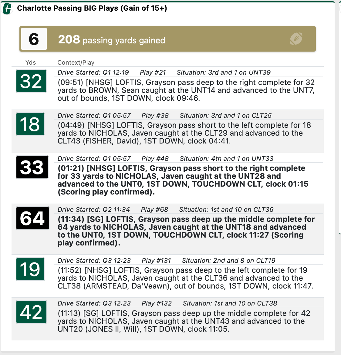To date, we have not seen North Texas seriously threatened by the pass game. Opponents up to this point have been run-game oriented (heavily) and the concern was in giving up some long runs. We can add some more anecdotes to those concerns after this game. Eric Morris said he was concerned about the explosives and Charlotte hit some big ones.
