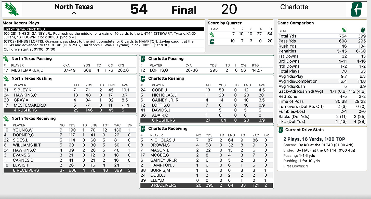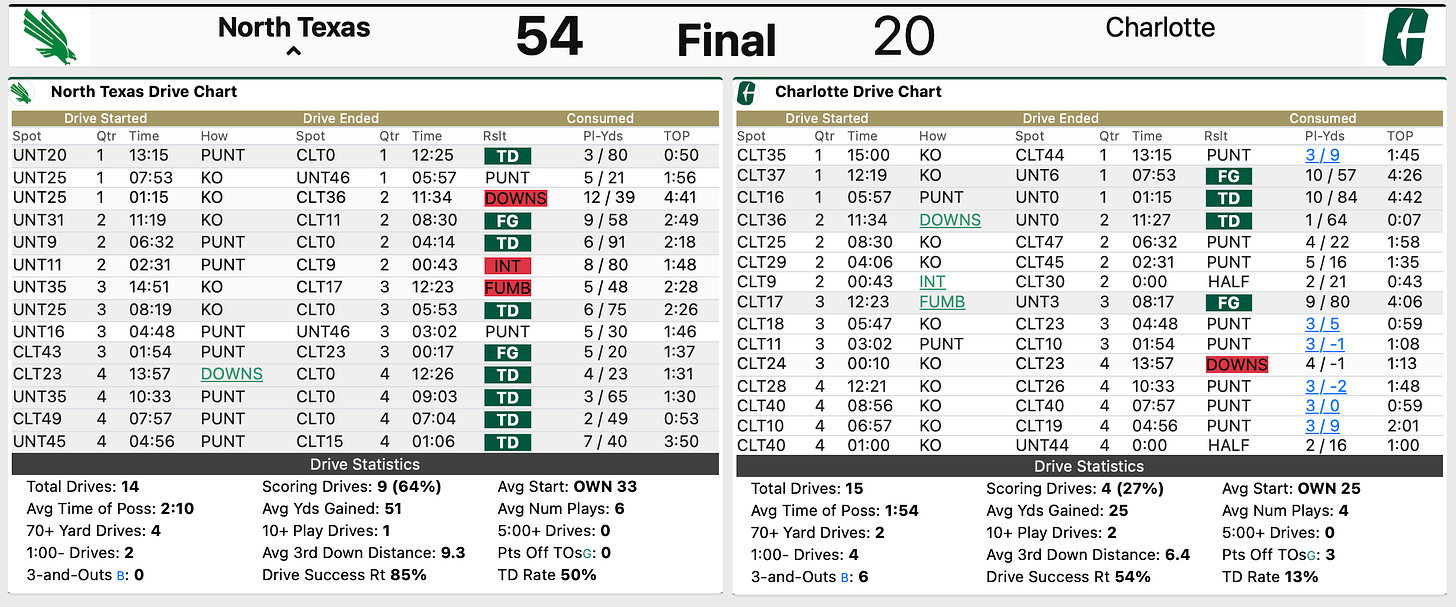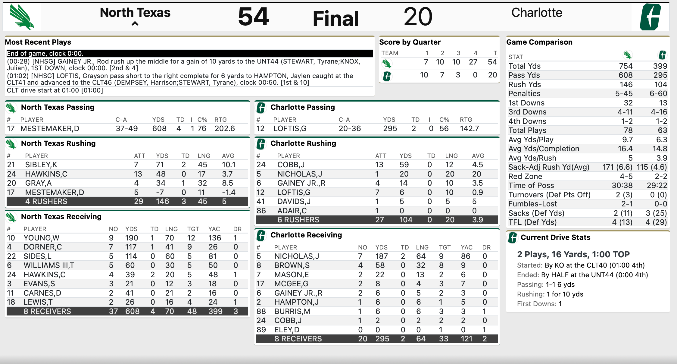 In the lead up to the game, MGN wrote that this should be a blow out. We wrote ‘52-3’ given Charlotte’s performance to date, and North Texas’ potency. If you are a post-game box-score watcher you see the result and think “went about as expected”. Yes, and no. North Texas was down 17-7 for a while there.