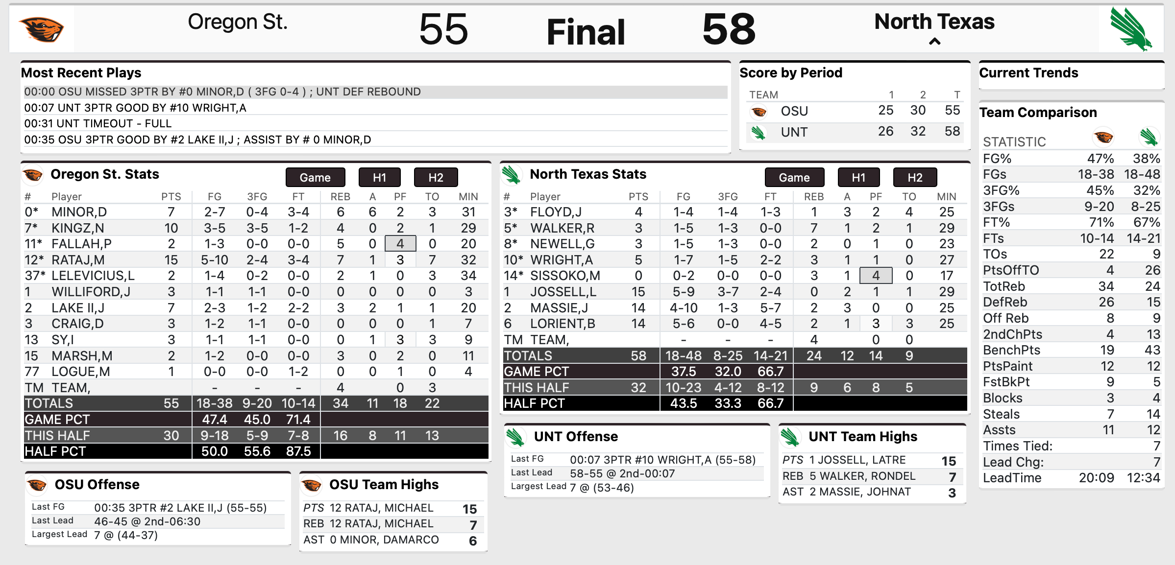 You like defensive basketball? You like fighting for every possession? You like offensive attacks that look like FB Dive plays? Well this was the game for you. North Texas had a one point lead at the half with just 32% shooting. They finished the game with 38% and won by three. The 26 points off turnovers were the key. Oregon State had 22 turnovers to N…