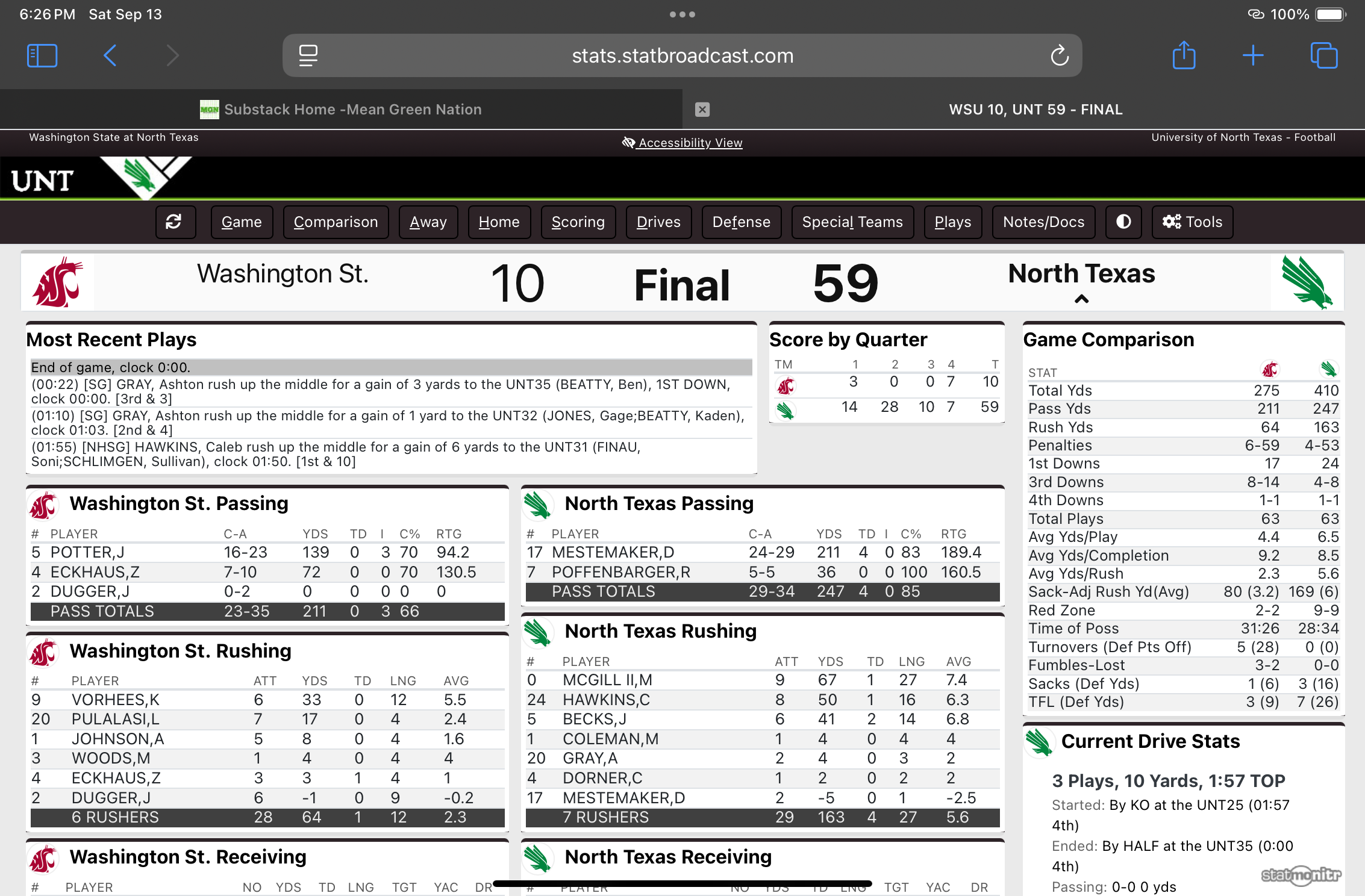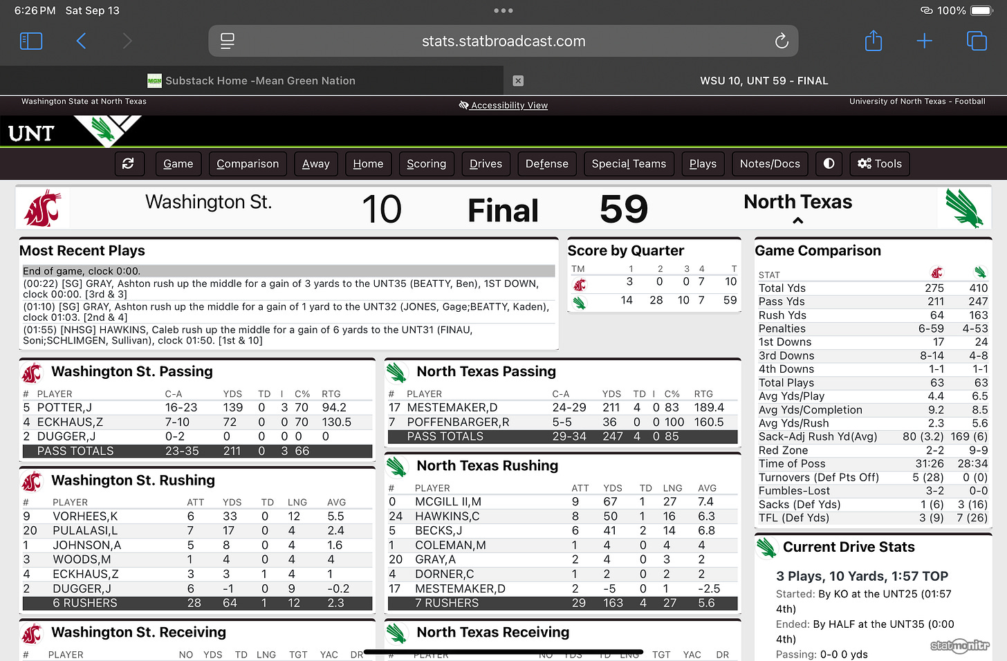 I completely understood why Morris wanted his team to get points in the second half because they simply hadn’t run many plays. In the end they had just 63 plays — as many as WSU. North Texas was just much more effective. Sure, there were a couple punts and a sack. And maybe a misthrown ball. Who cares?