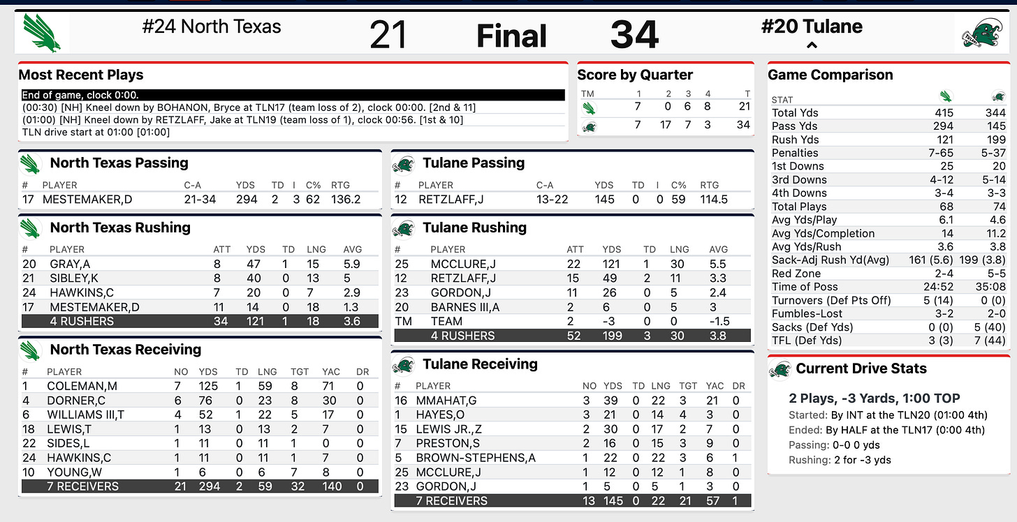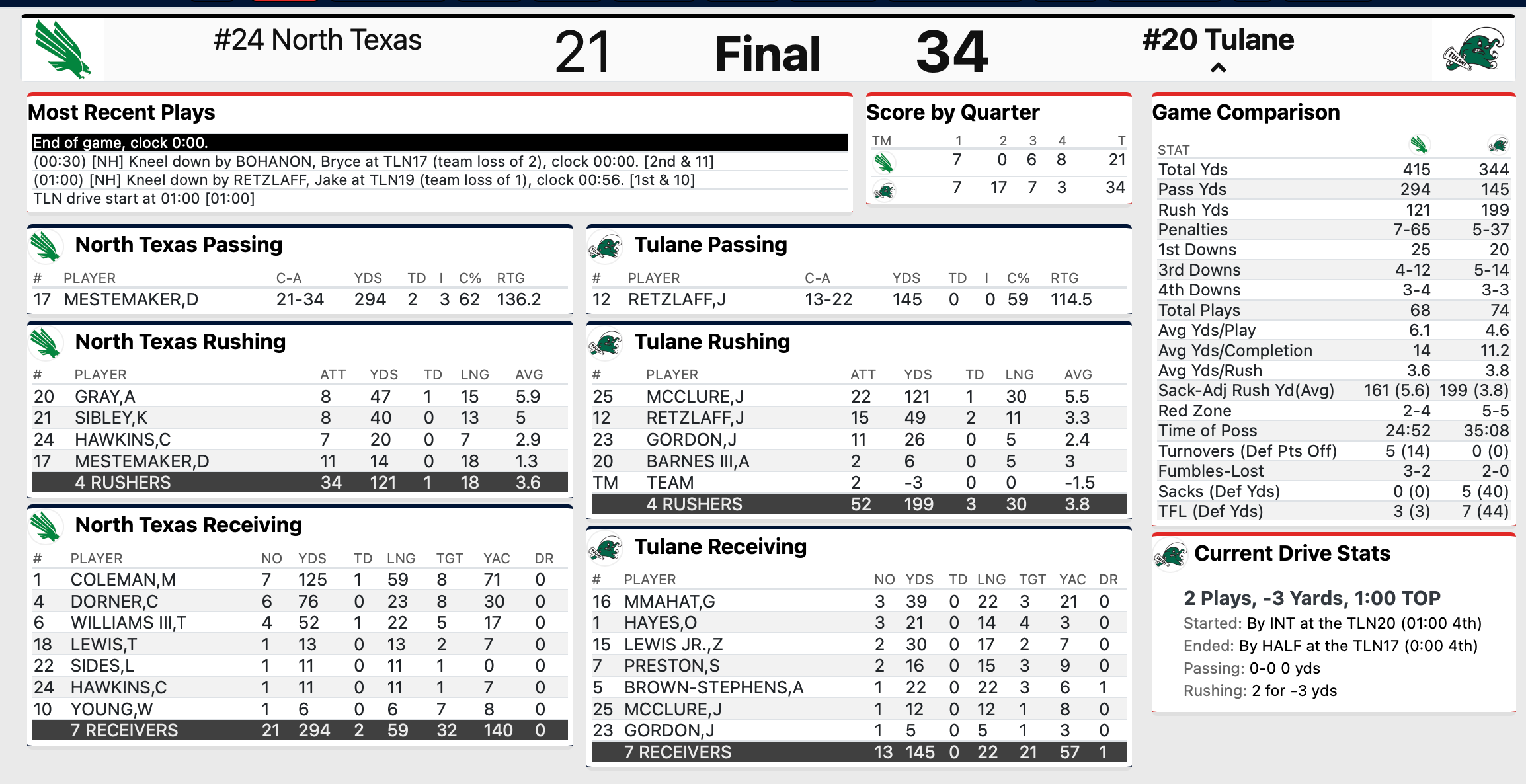 The game was all but lost after NT’s two scores got the team within ten. Tulane was driving and on 3rd-and-6 Retzlaff fired a ball straight to S’Maje Burrell. It went through his hands — that had pick-six all over it — and instead was completed. More bad luck (that it was caught and not incomplete). Instead of a punt, or a sure touchdown, Tulane drove for a FG. North Texas got the ball with basically no time left, and the game ended on the interception. Even if they score there, it would have required an onside kick.